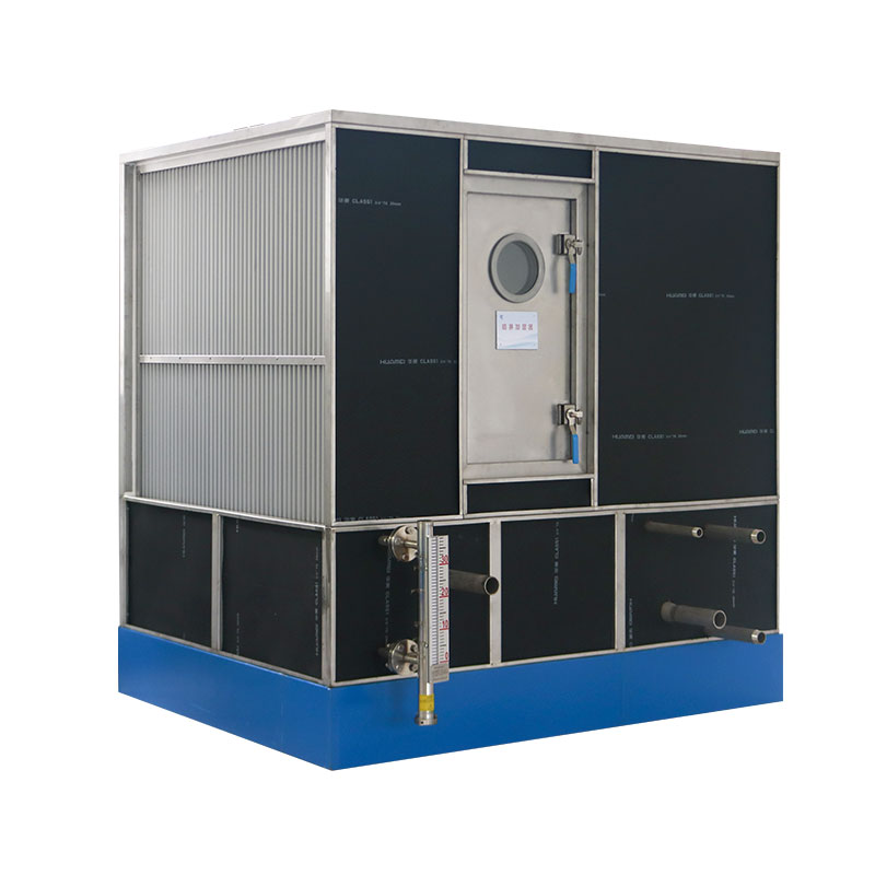 В распылительной камере вода определённой температуры (менее 100 °C) напрямую контактирует с воздухом, обмениваясь теплом и влагой.